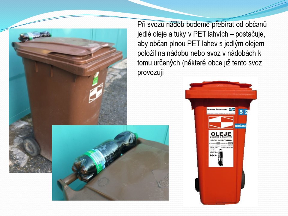 Kuchyňské oleje a tuky nebudou převzaty v jiných nádobách než jsou čiré PET lahve!! Neprůhledné nádoby neumožňují kontrolu odpadu. Bohužel se stává, že se takto někdo snaží odstranit motorové oleje a jiná maziva.